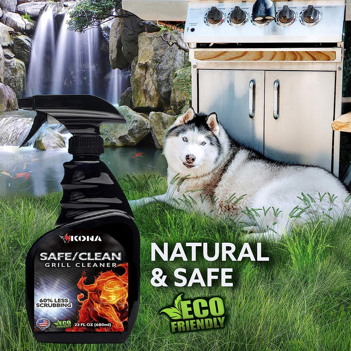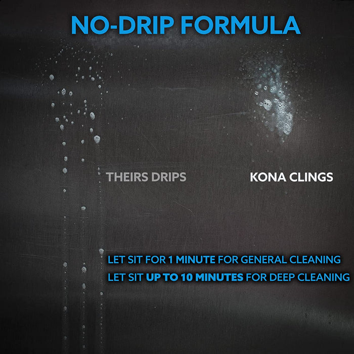 • BEST NO-DRIP GRILL DEGREASER & OVEN CLEANER - Watch grease dissolve with the new Kona Safe/Clean grill cleaner. A breakthrough powerful grill cleaner spray that breaks down tough grease & char stains by clinging to the surface rather than dripping off. Removes tough baked-in grease, grime, and food particles.